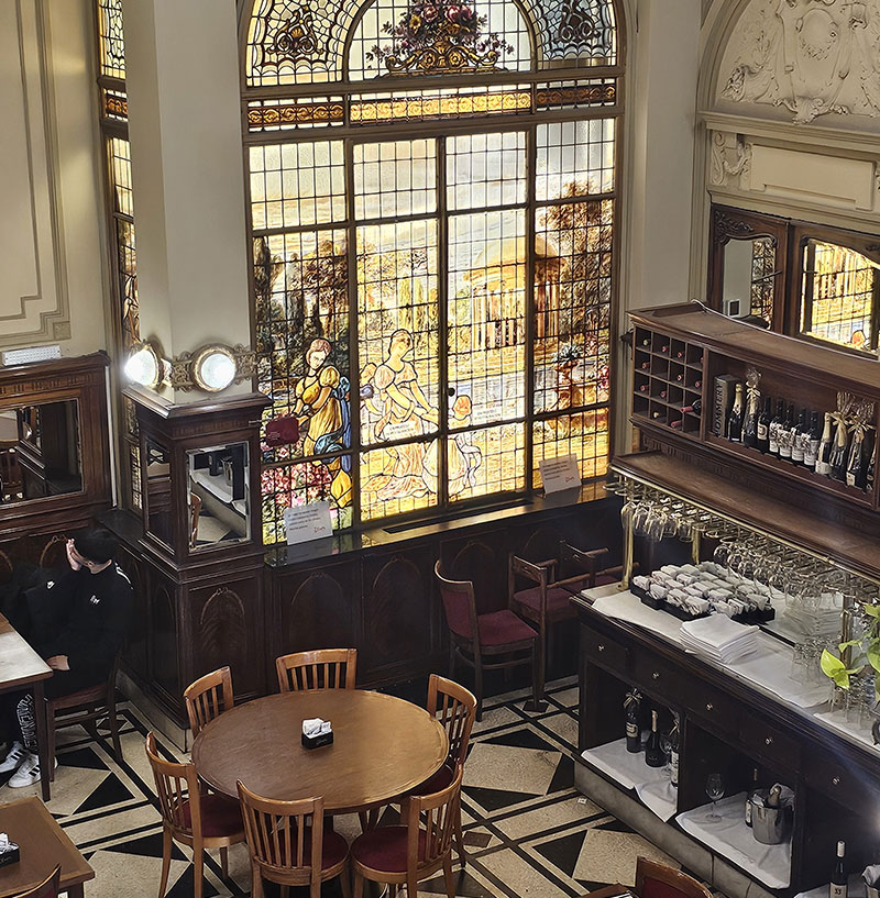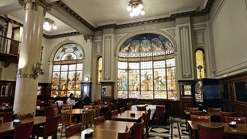 Estos adornan sus techos y paredes y son una verdadera obra maestra. Sus colores y sus complejos diseños no solo iluminan el espacio con una belleza única, sino que también cuentan historias del pasado, transportándote a una época de esplendor y elegancia. Son un testimonio silencioso de la rica herencia cultural de la Ciudad, uniendo la maestría artesanal con el encanto inconfundible de este café.